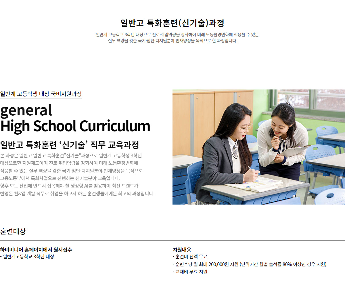 본 과정은 일반고 특화훈련“신기술”과정고등학생의 진로·취업역량을 강화하여 미래 노동환경변화에 적응할 수 있는 실무 역량을 갖춘 국기·첨단·디지털분야 인재양성을 목적으로 고용노동부에서 특화사업으로 진행하는 신기술분야 교육입니다. 향후 모든 산업에 반드시 접목해야 할 생성형 AI를 활용하여 최신 트랜드가 반영된 웹&앱 개발 직무로 취업을 하고자 하는 훈련생들에게는 최고의 과정입니다.